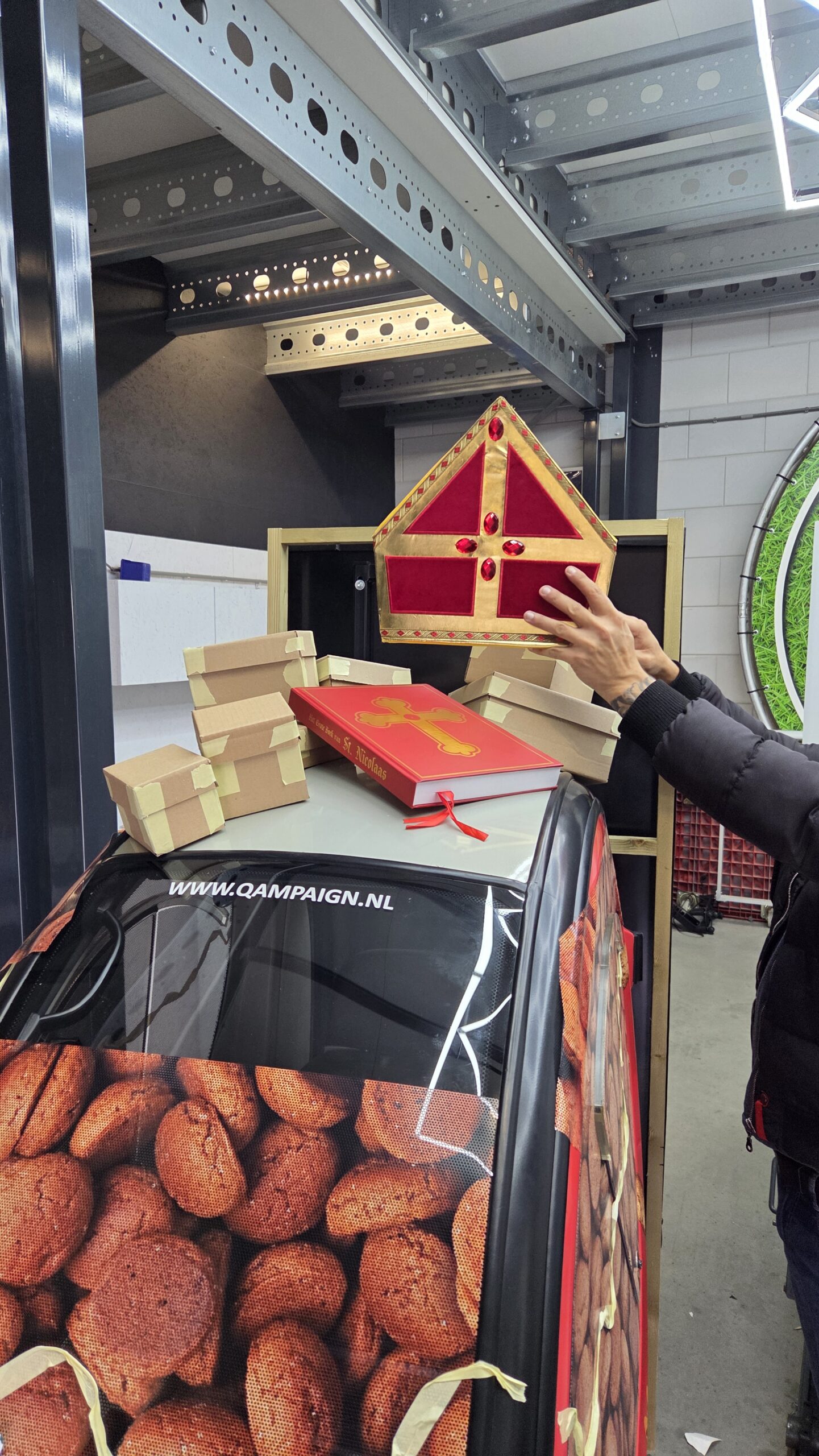 Tijdens de bouw ontstond er nog een praktisch probleem toen de bak achterop zo zwaar werd dat de voorwielen van de Q-Car loskwamen van de grond. Nul10 Reclame wist dit snel op te lossen, waarna het team de thematische details aanbracht zoals cadeaus, een mijter, staf, het grote boek en een 3D-geprint handvat dat aanwezigen kunnen gebruiken om zelf een portie pepernoten te tappen.